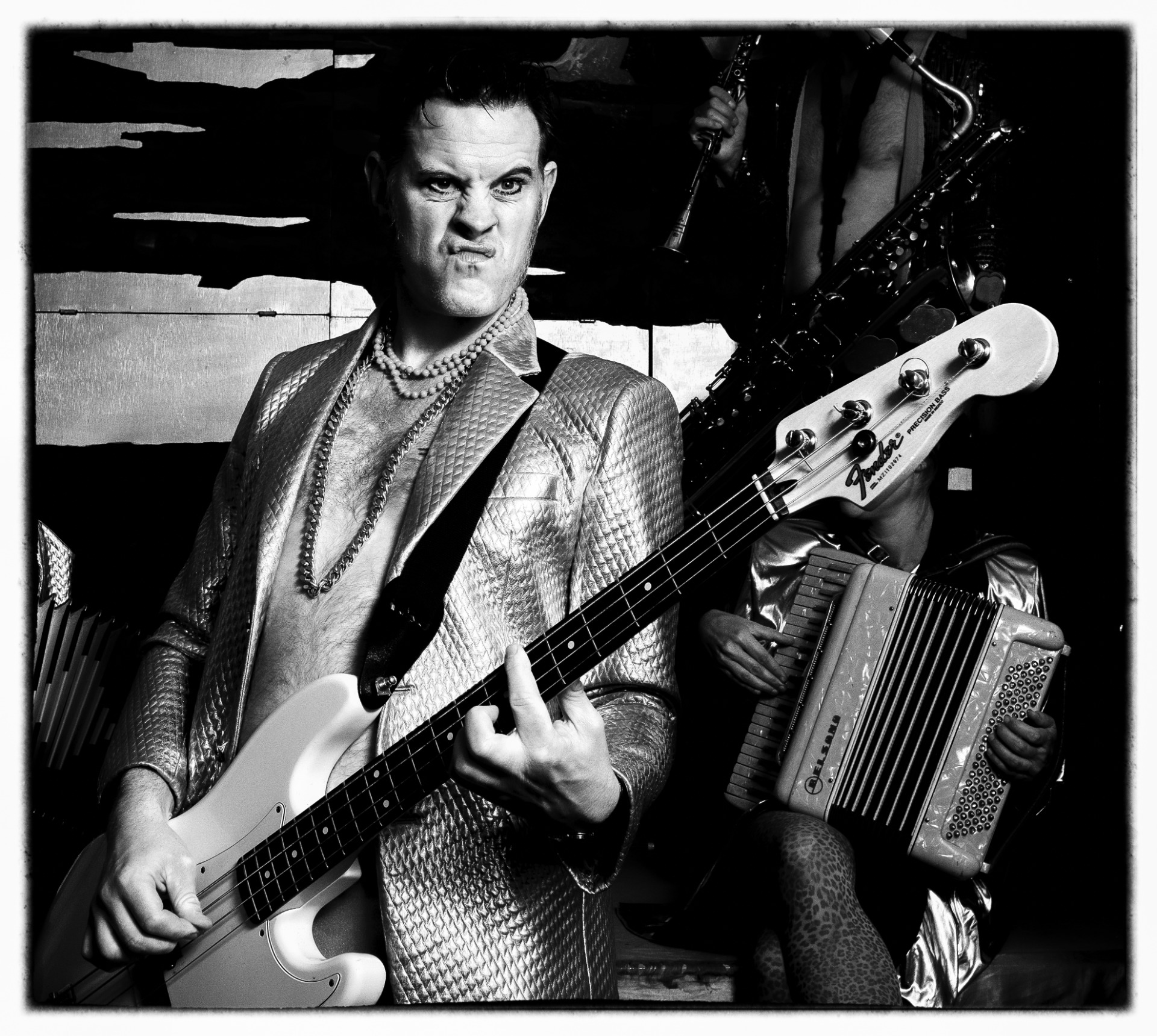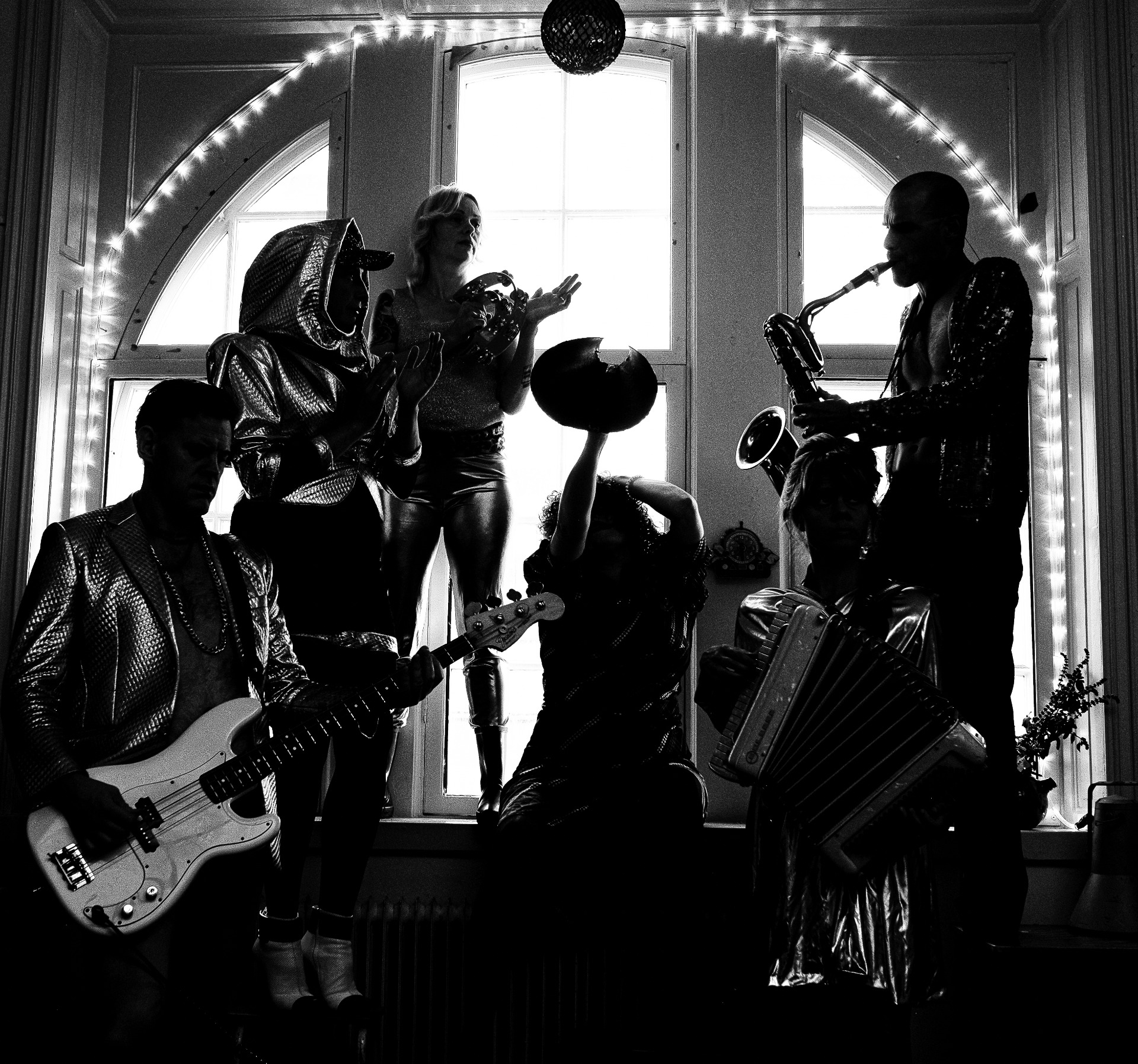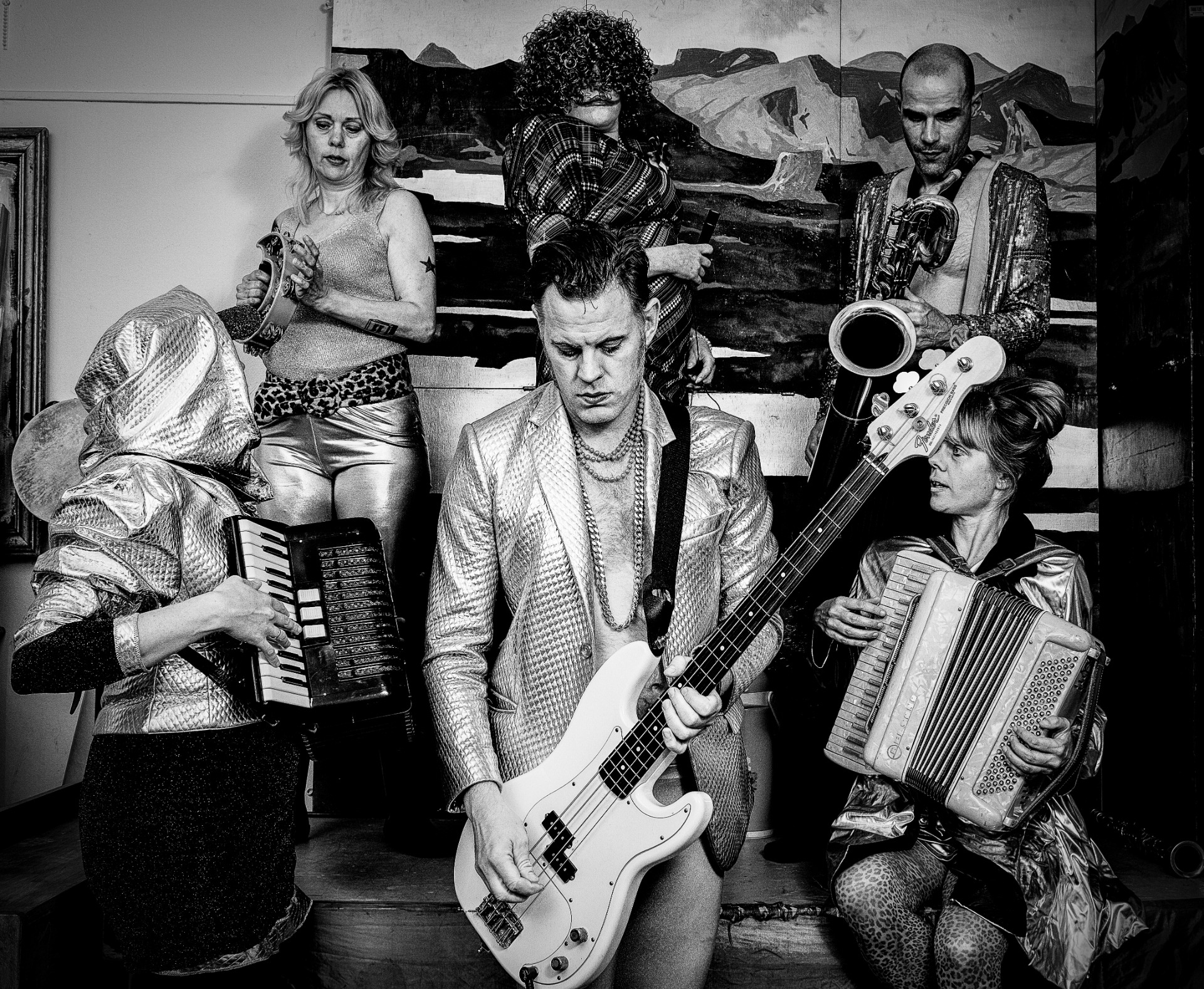 Anders Norrman (saxophone/ clarinet), a world-citizen and ecological beekeeper, and also conductor of the jazz chapel The Moocher. Amanda Fritzén (accordion/chorus), passionate theater actress and music teacher, and also a member of the famously delicate tango orchestra Darya och månskensorkestern. Jeanette Axlander (percussion/chorus), an eminent vintage-shop manager in Soho in Stockholm, and also a member of the synthpop group Stilla Havet. Martin Englund (bass-guitar/chorus), PhD-student and most eloquent history lecturer on and off stage, is a former member of the legendary punkrock band Stockholm Pigs. Karin (piano/chorus) music composer, sailor, and a former member of the notorious punk-folk group Molly. Rosie M. (vocals), German cabaret-singer and Brecht-interpreter, who left her heart to bleed somewhere behind the Berlin Wall.